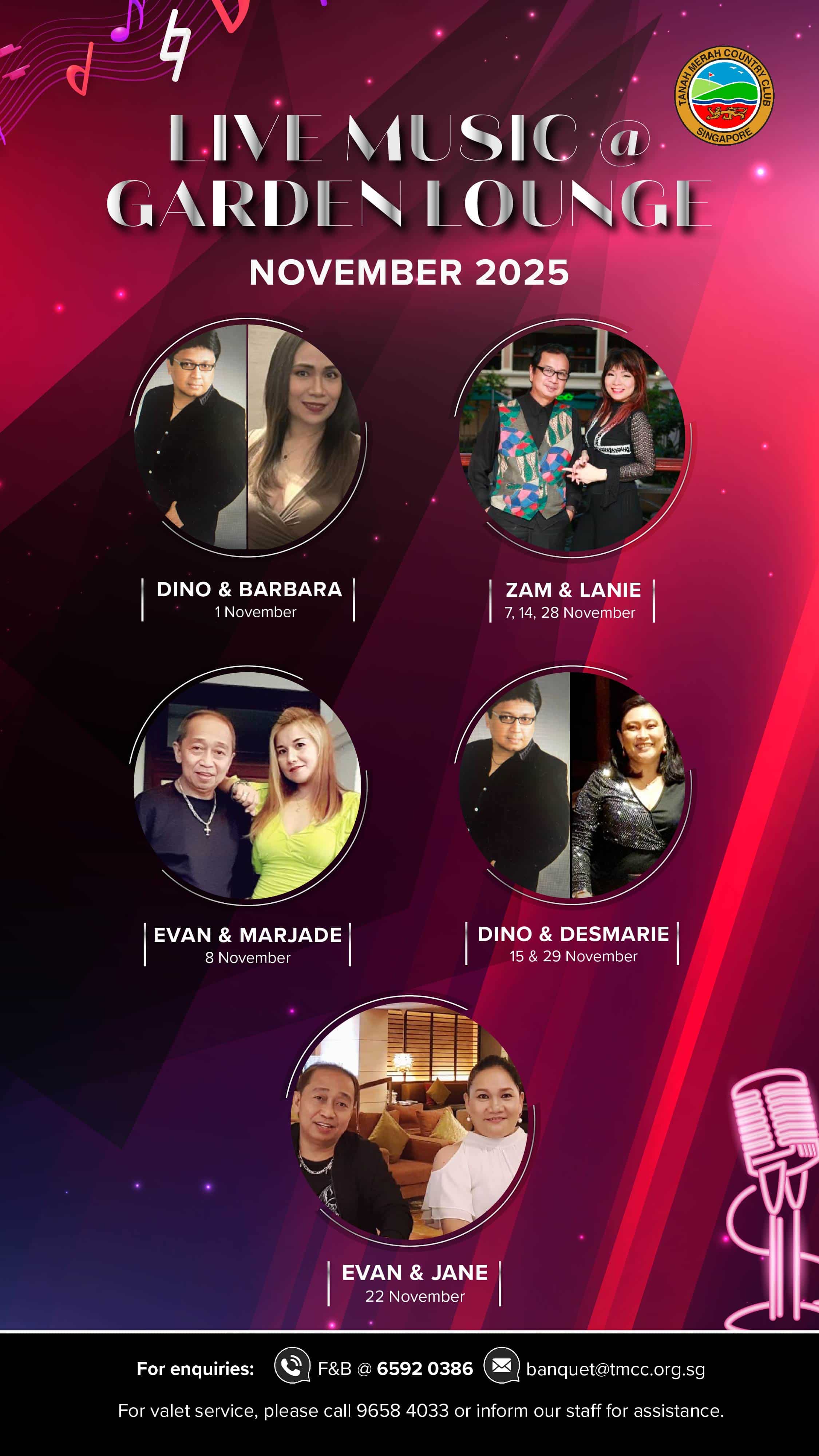 Entry fee of $21.80 (inclusive of prevailing GST) will be charged for Members’ guests visiting the Garden Lounge. This fee applies only on Friday and Saturday nights with live music performances