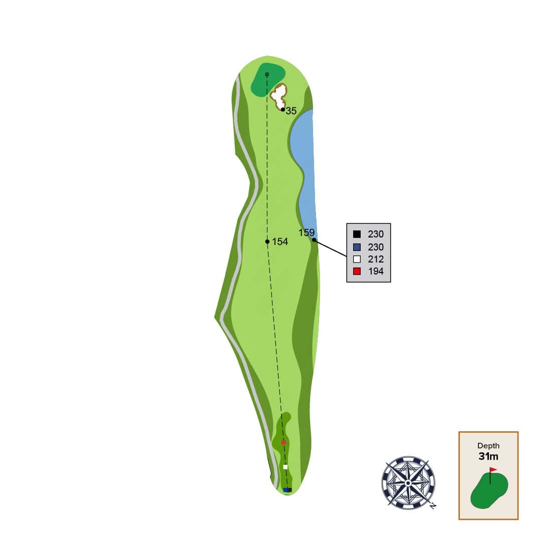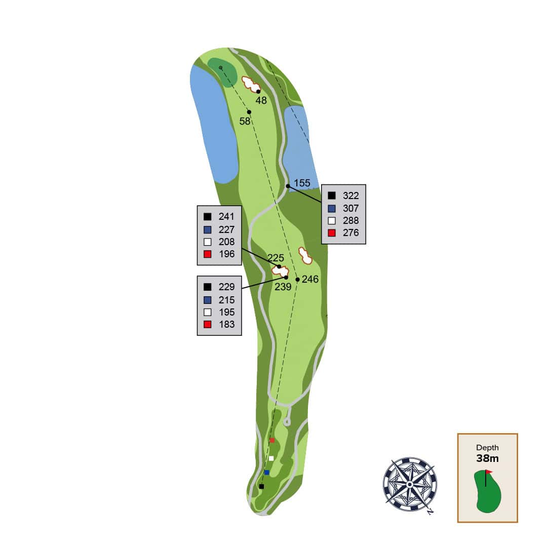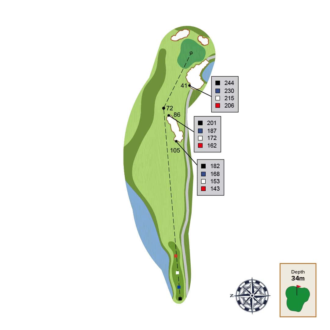 A long meandering serpentine par 5 is punctuated by a central "decision” bunker. The best angle into the green will be by taking on this central bunker and approaching the green from the right side of the fairway.