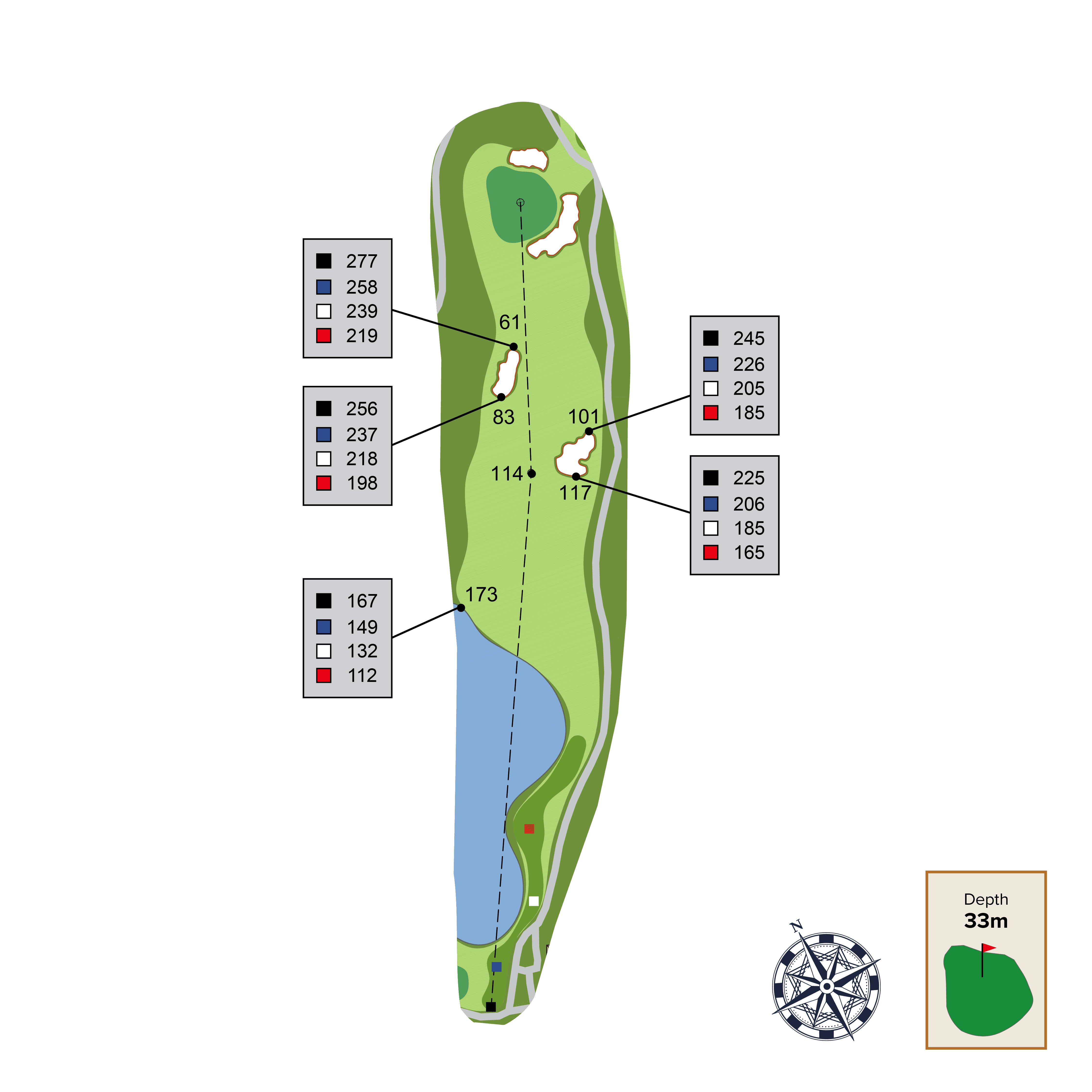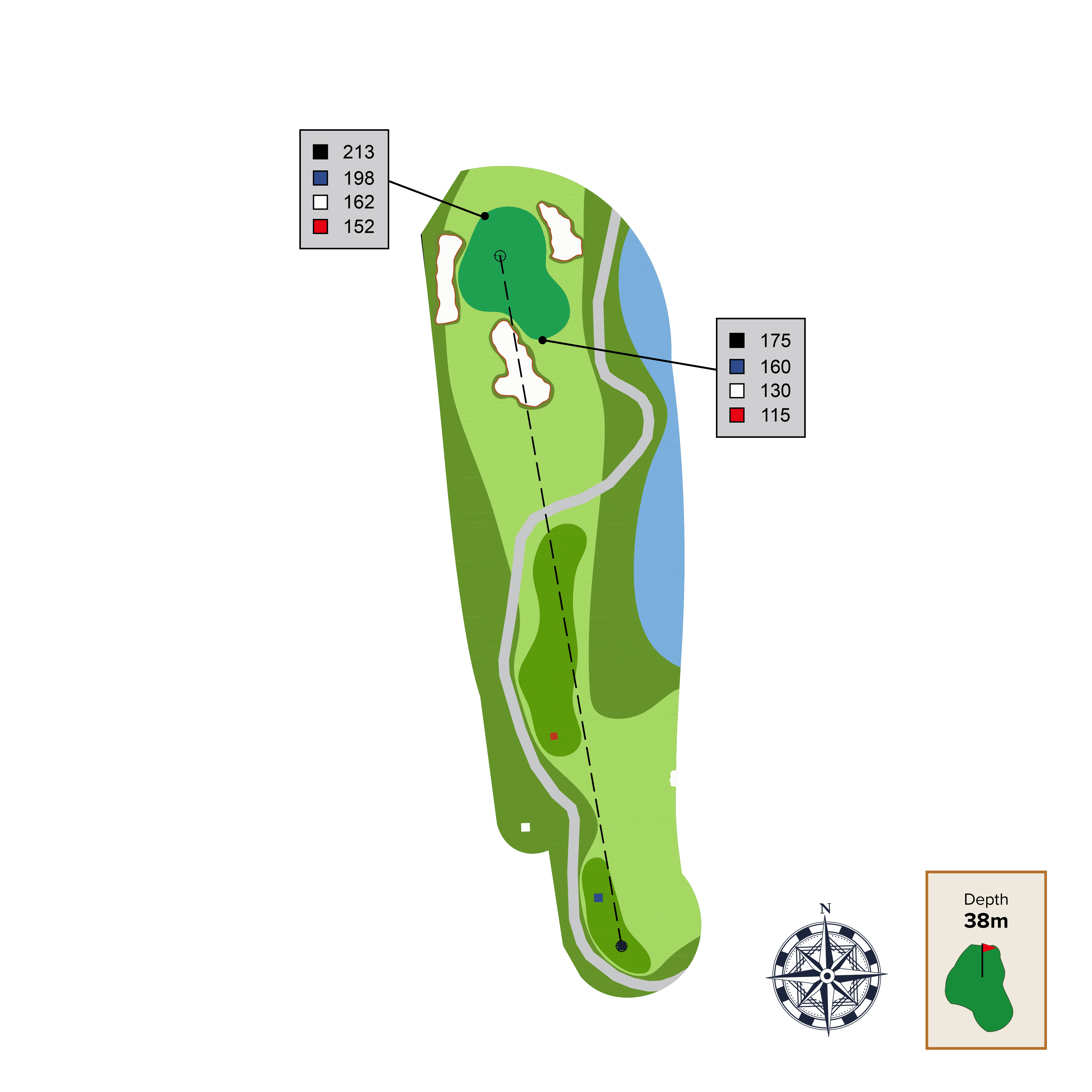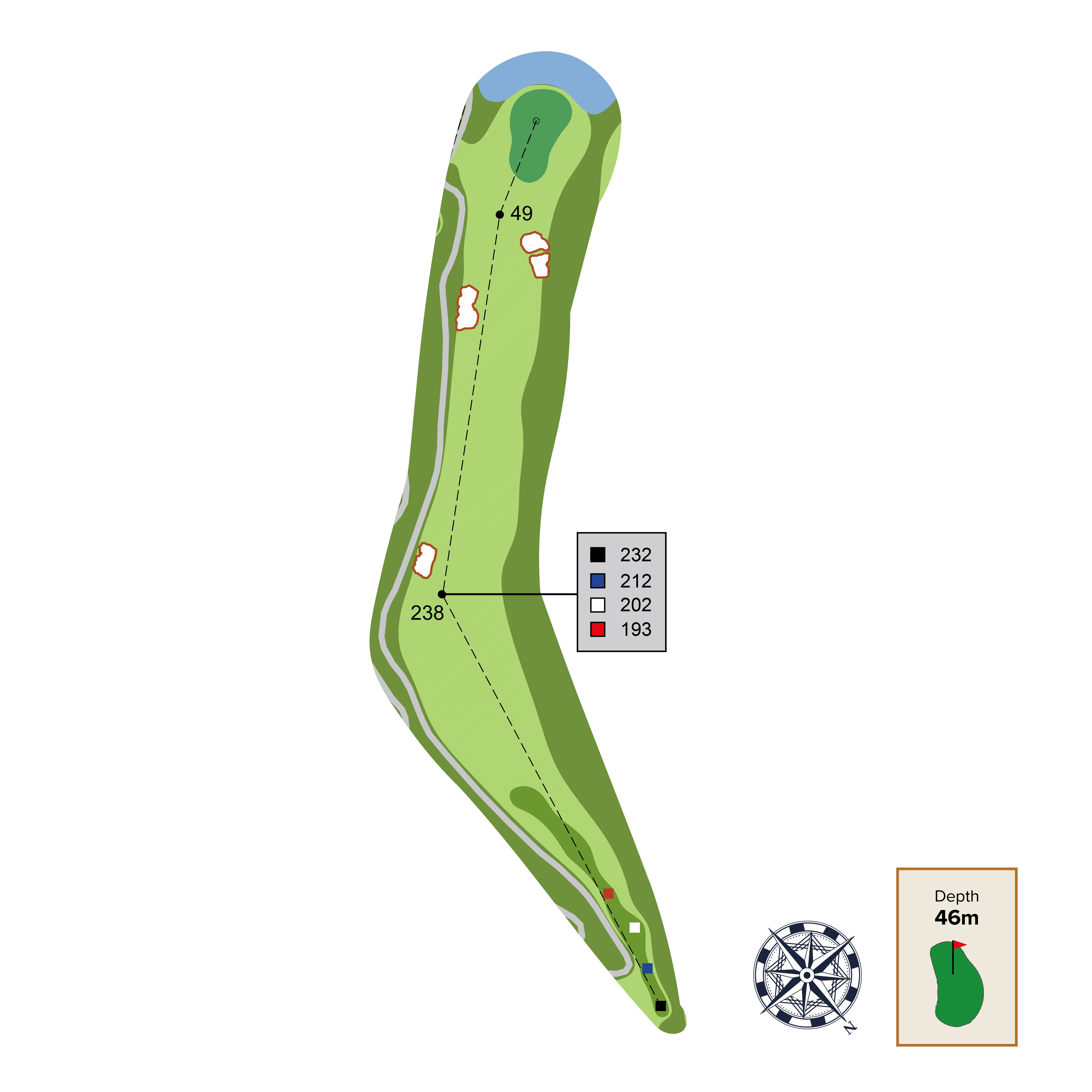 A long meandering serpentine par 5 is punctuated by a central "decision” bunker. The best angle into the green will be by taking on this central bunker and approaching the green from the right side of the fairway.