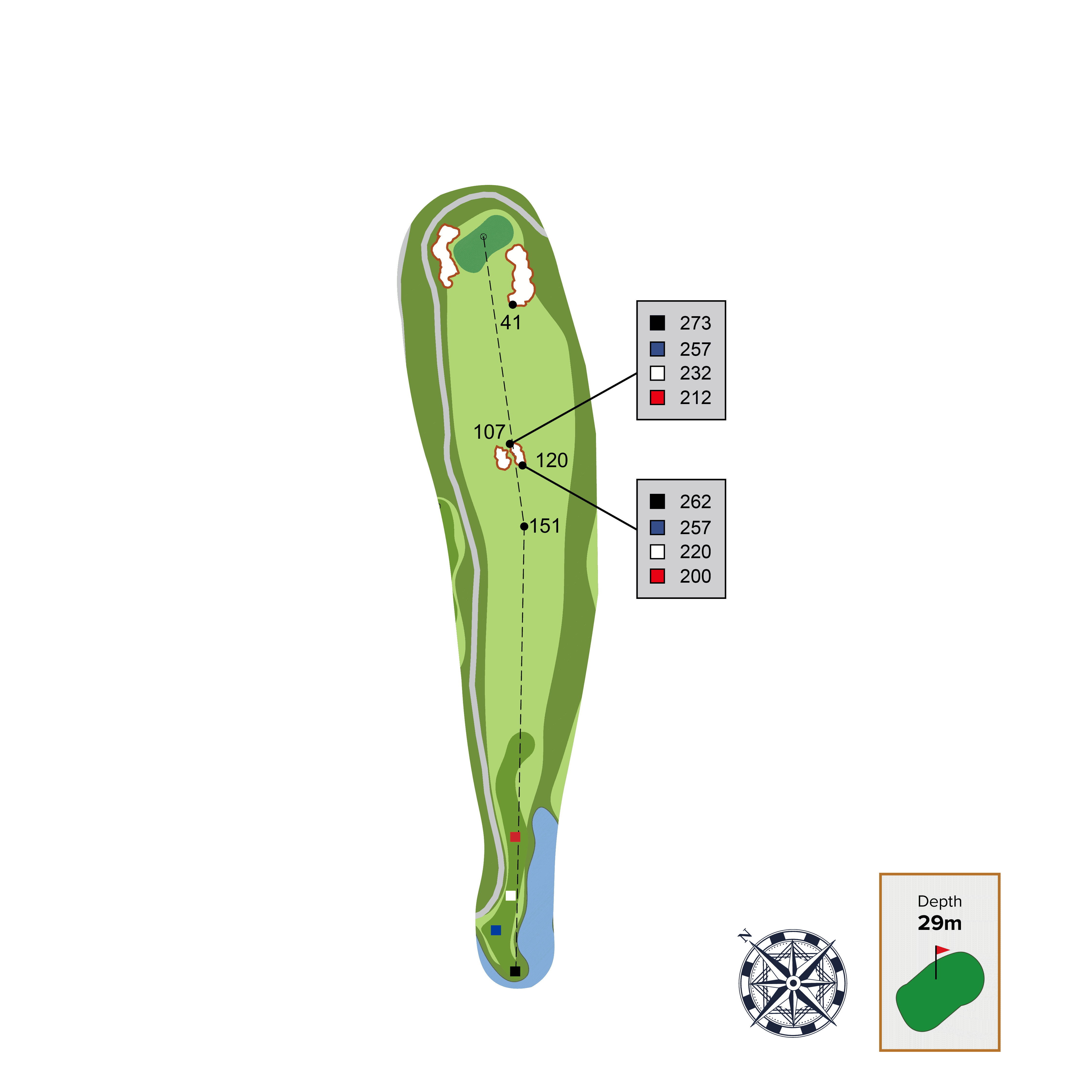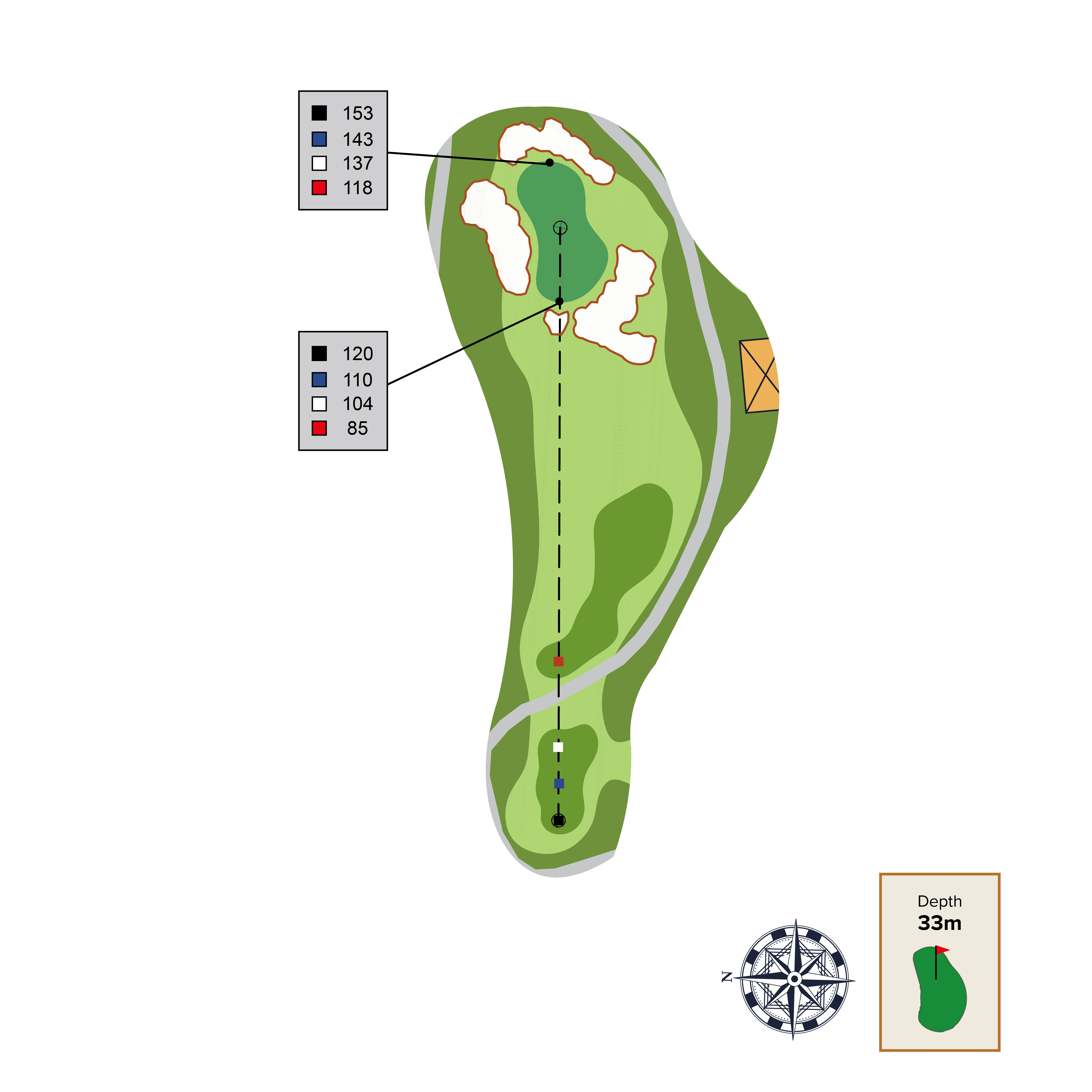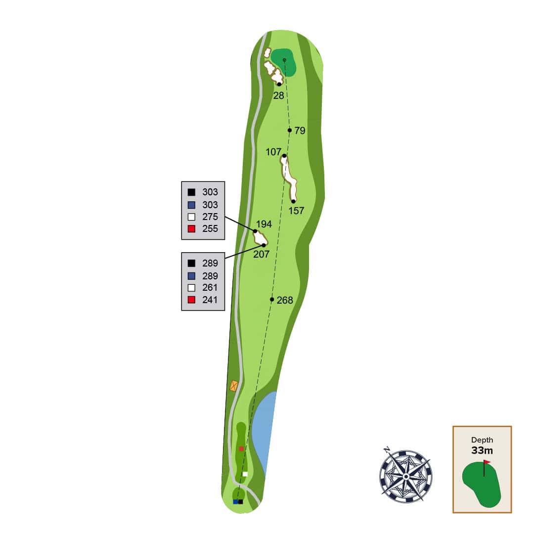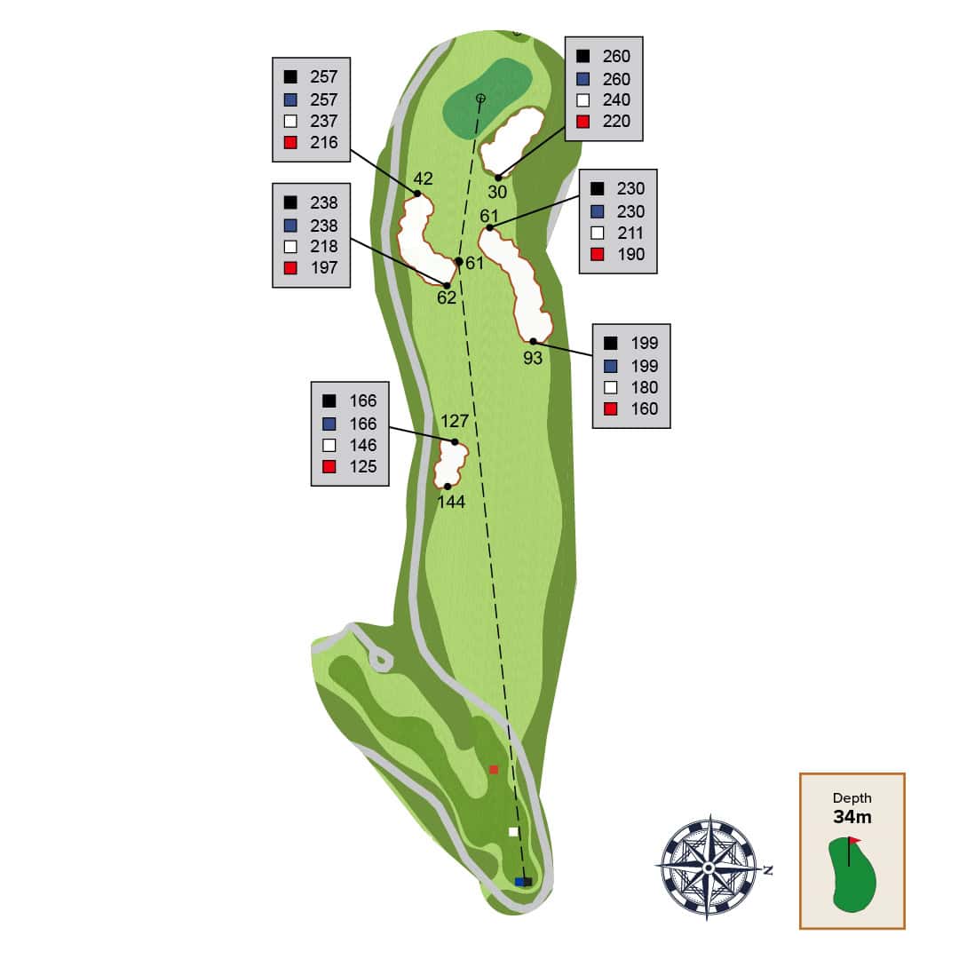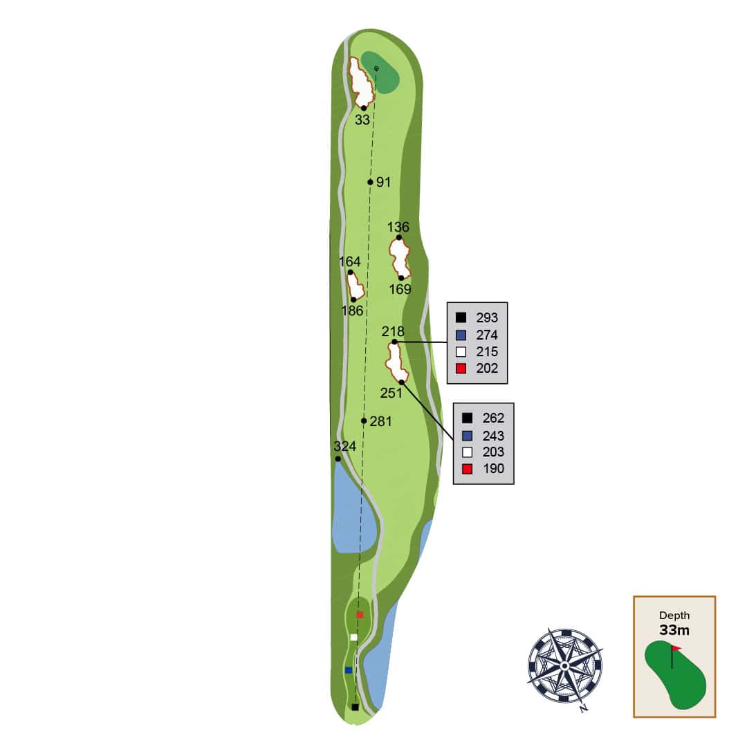 This straight away par 4 has two strategic bunkers that can be used as aiming points depending on the intended distance of your tee shot and skill level. The best place to approach this green from is as close to the far-left fairway bunker as possible. Be careful of the front left green contour as it will collect balls away from green.