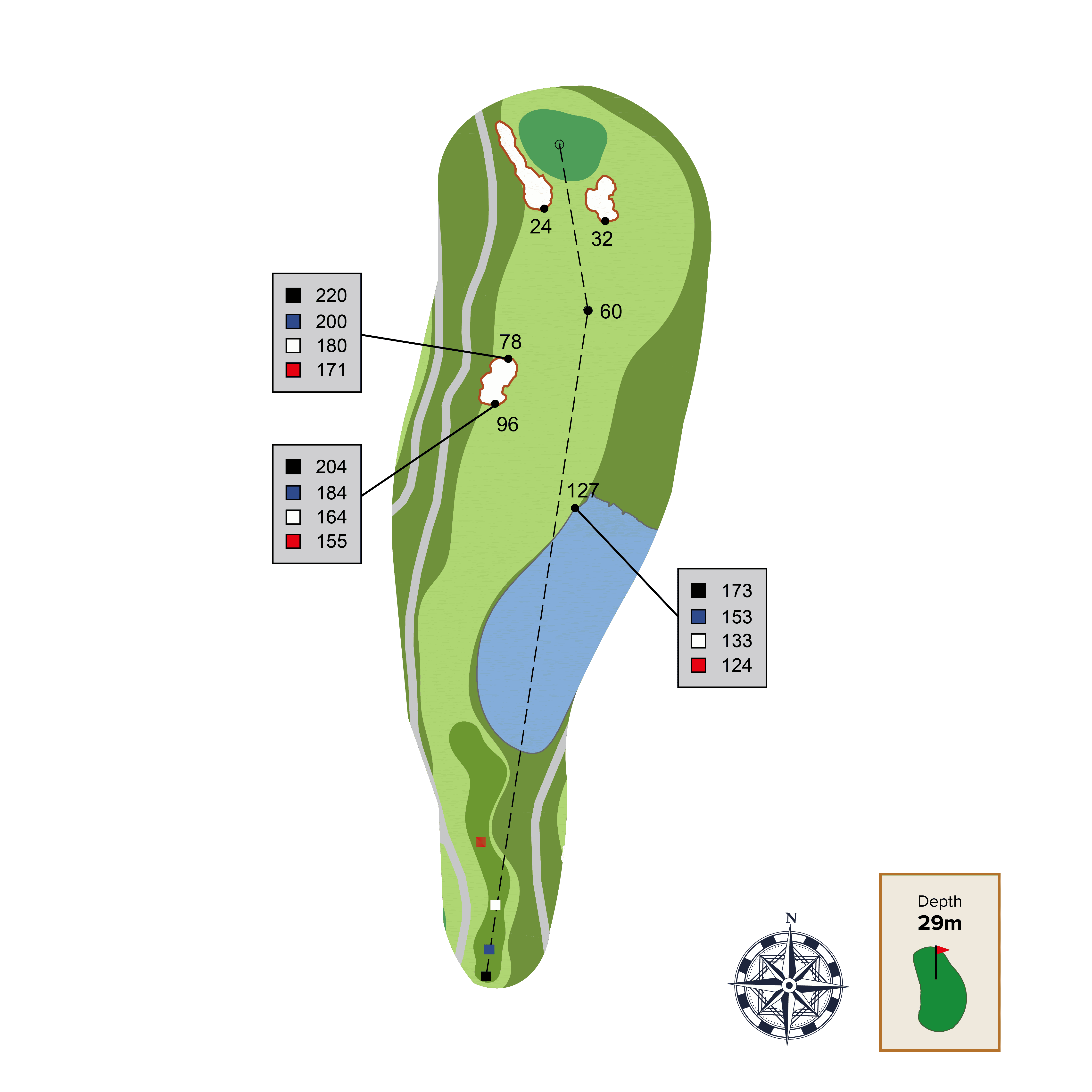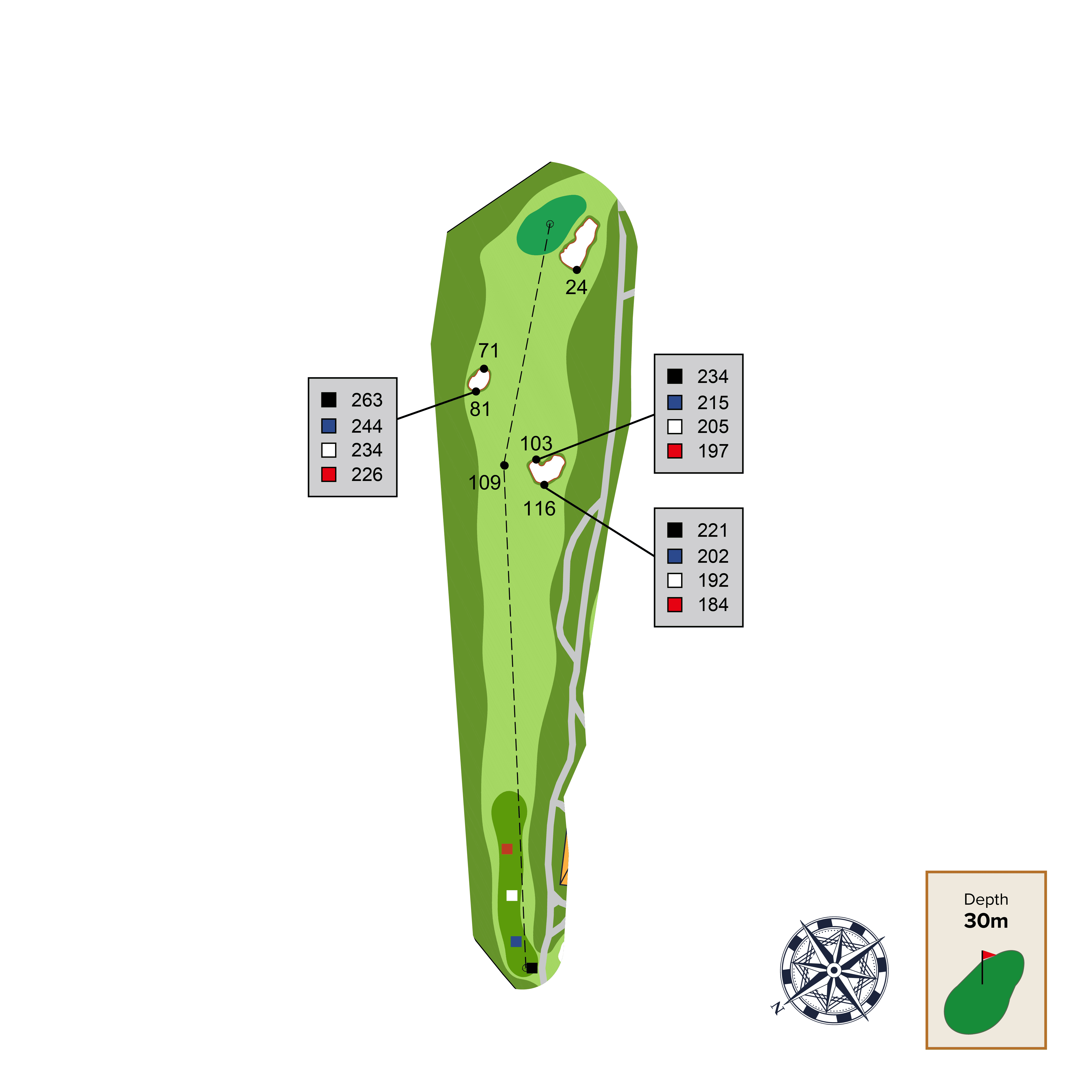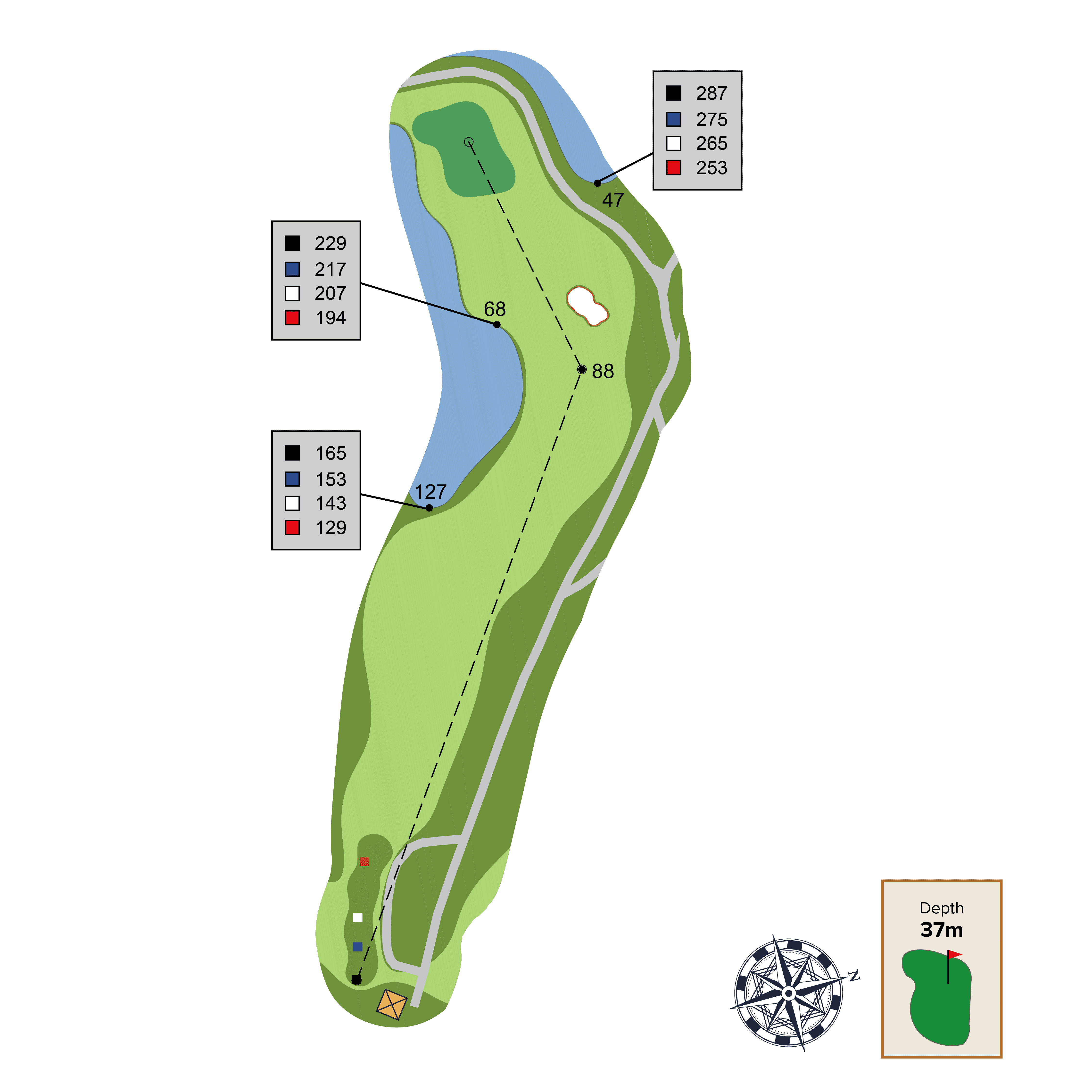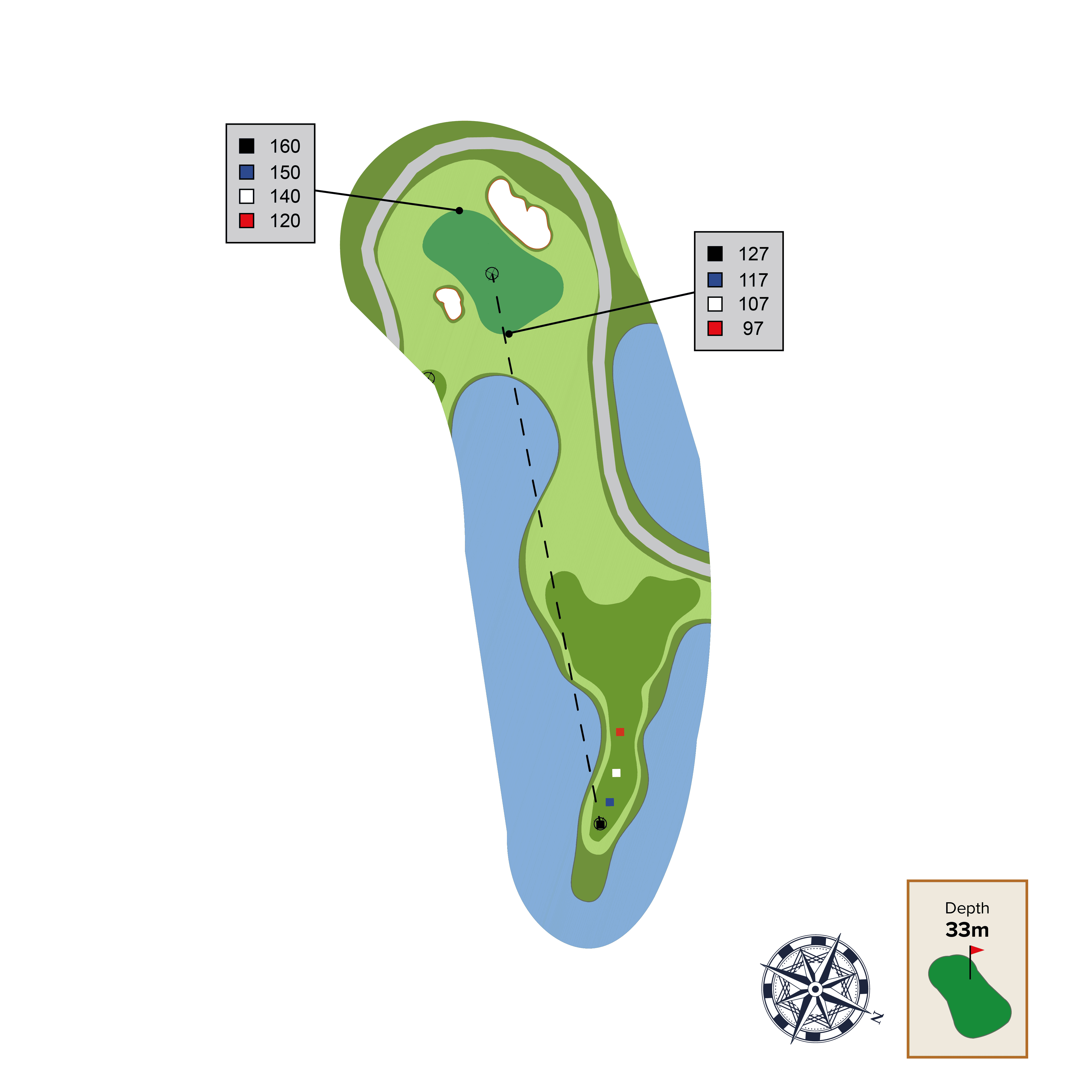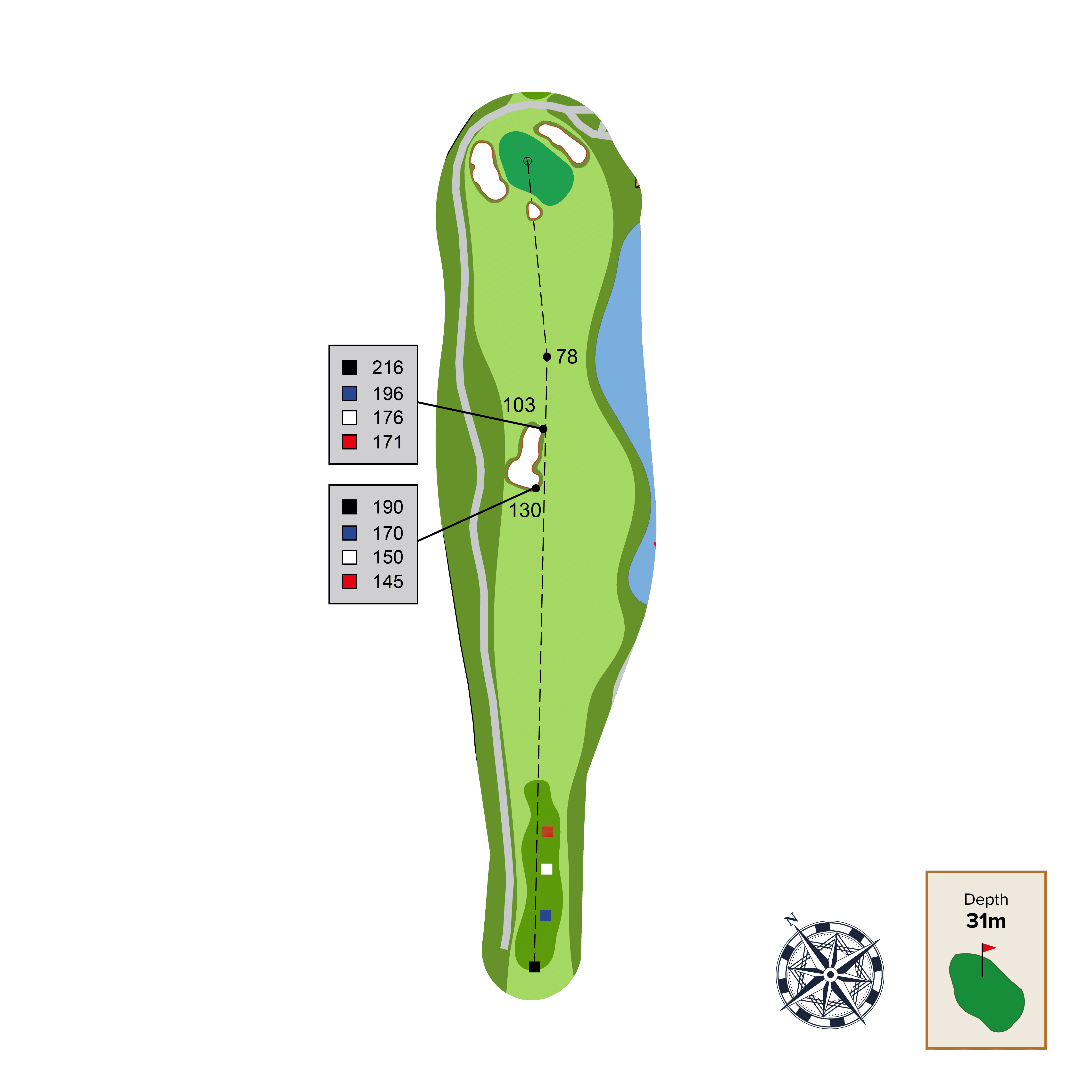 This straight away par 4 has two strategic bunkers that can be used as aiming points depending on the intended distance of your tee shot and skill level. The best place to approach this green from is as close to the far-left fairway bunker as possible. Be careful of the front left green contour as it will collect balls away from green.