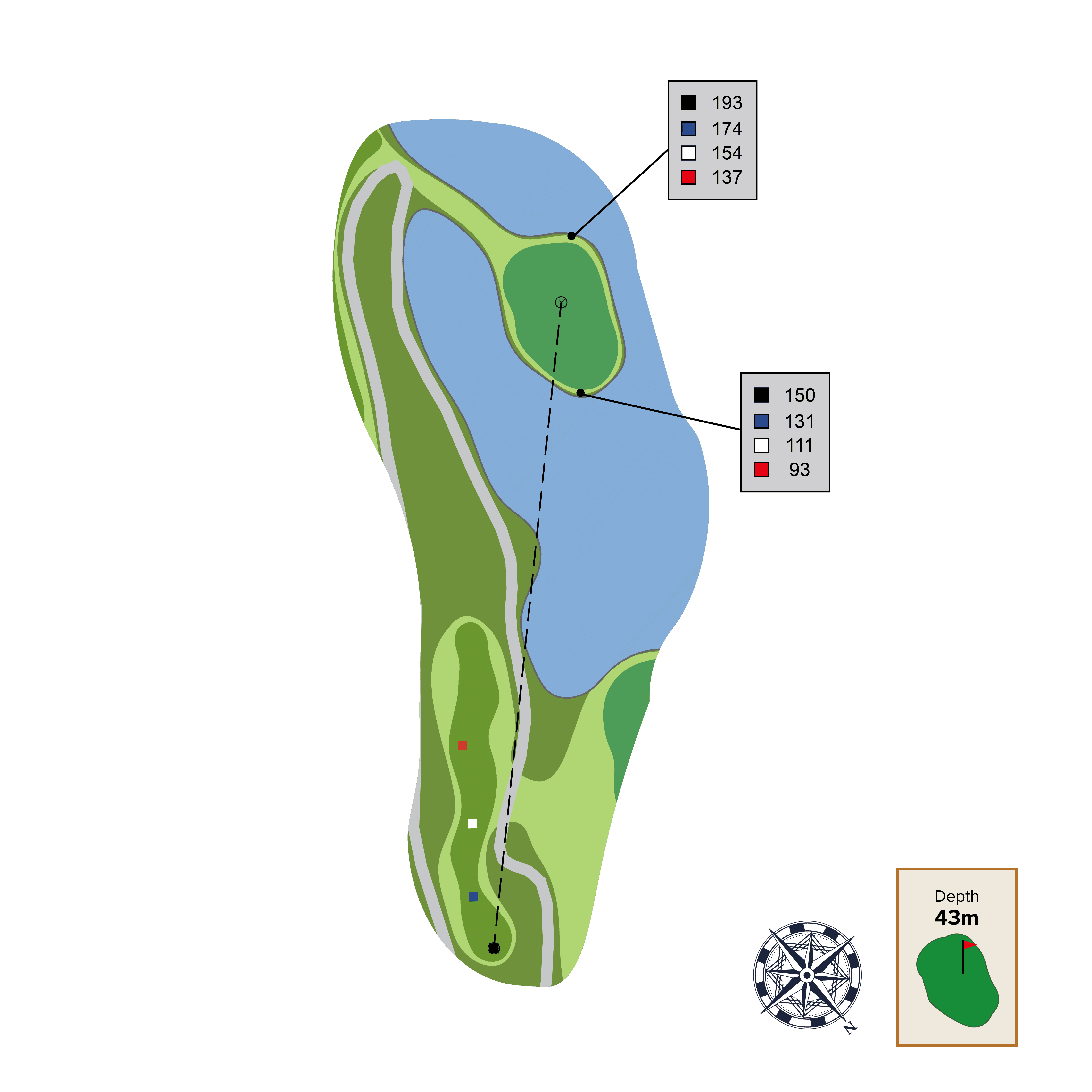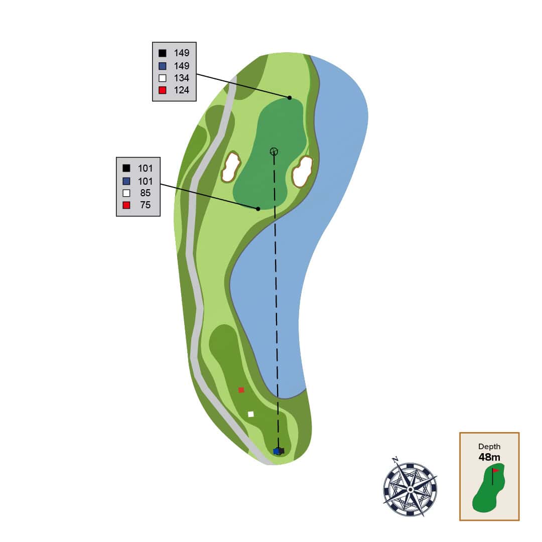 This island green, was reimagined from the original design and the large green will requires a dose of precision, nerve, and skill.