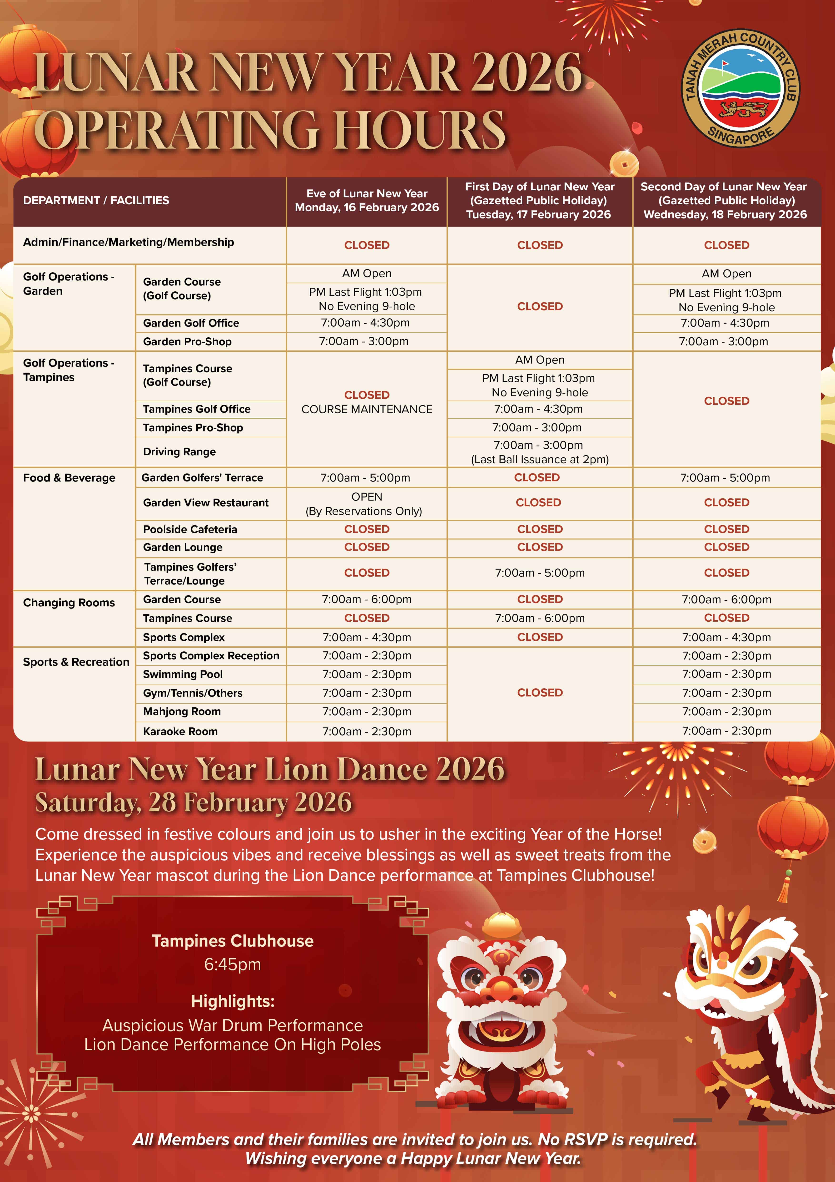 Lunar New Year 2026 – Club Operating Hours and Lion Dance Schedule [Updated]